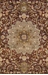 Off-white, shades of green and brown are the primary colors of this carpet, accented with navy blue, turquoise and beige.